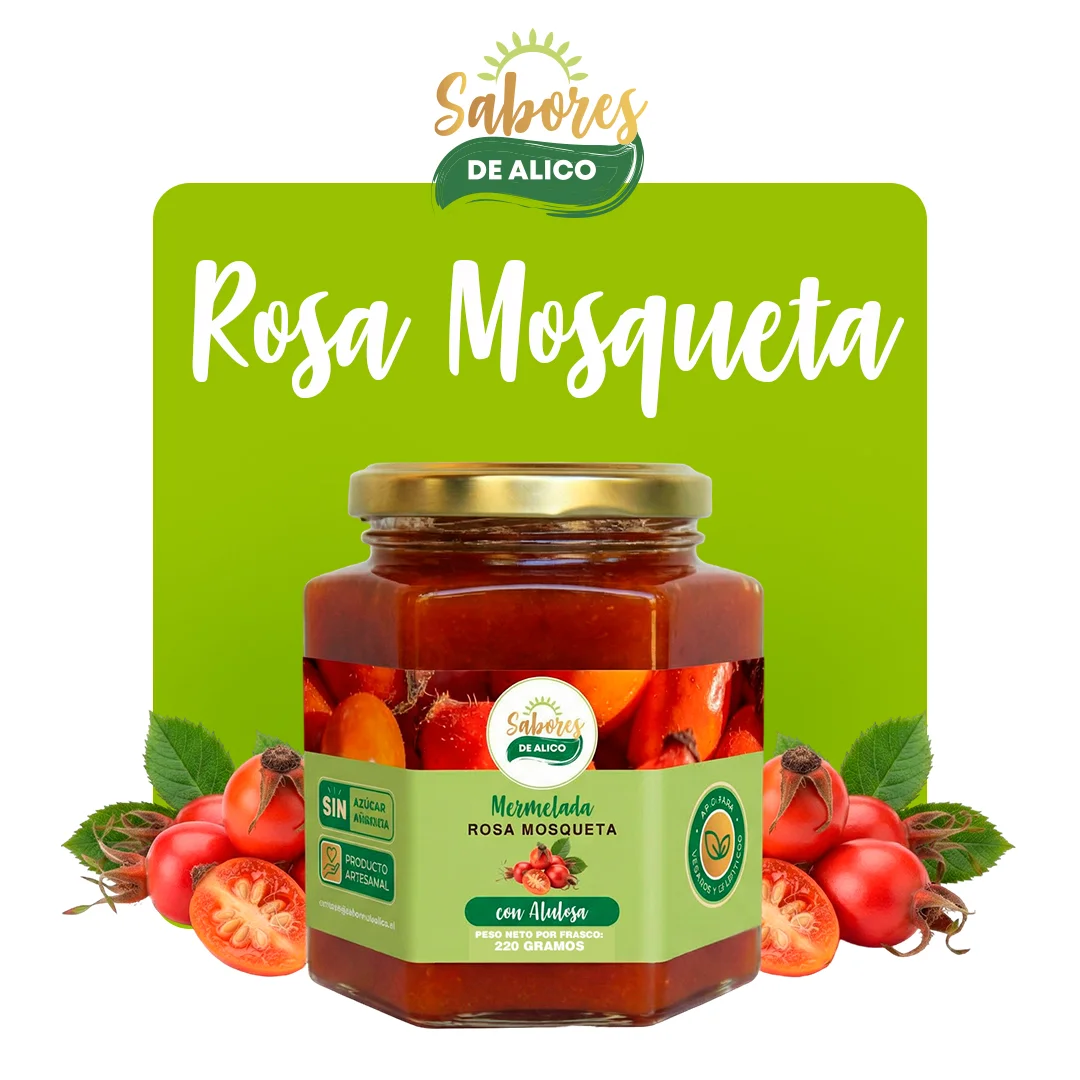 Ingredientes: Rosa Mosqueta, alulosa (25g/ 100 gr – 3.5/15 gr), ácido citrico, Sorbato de Potasio, benzoato de sodio.